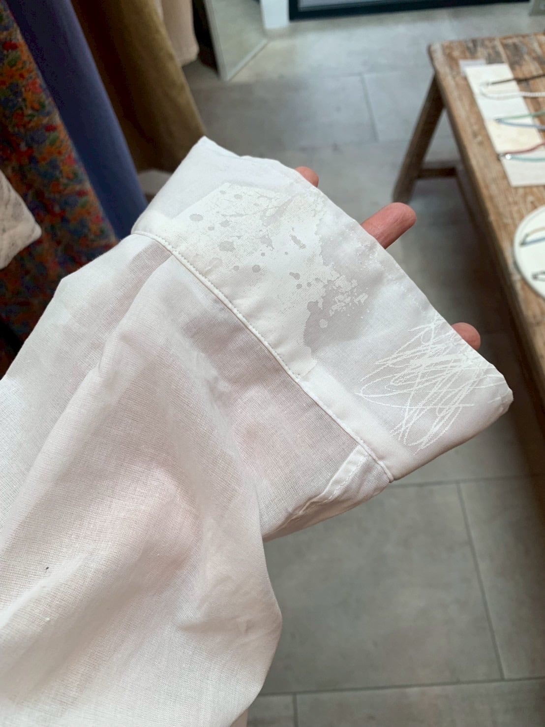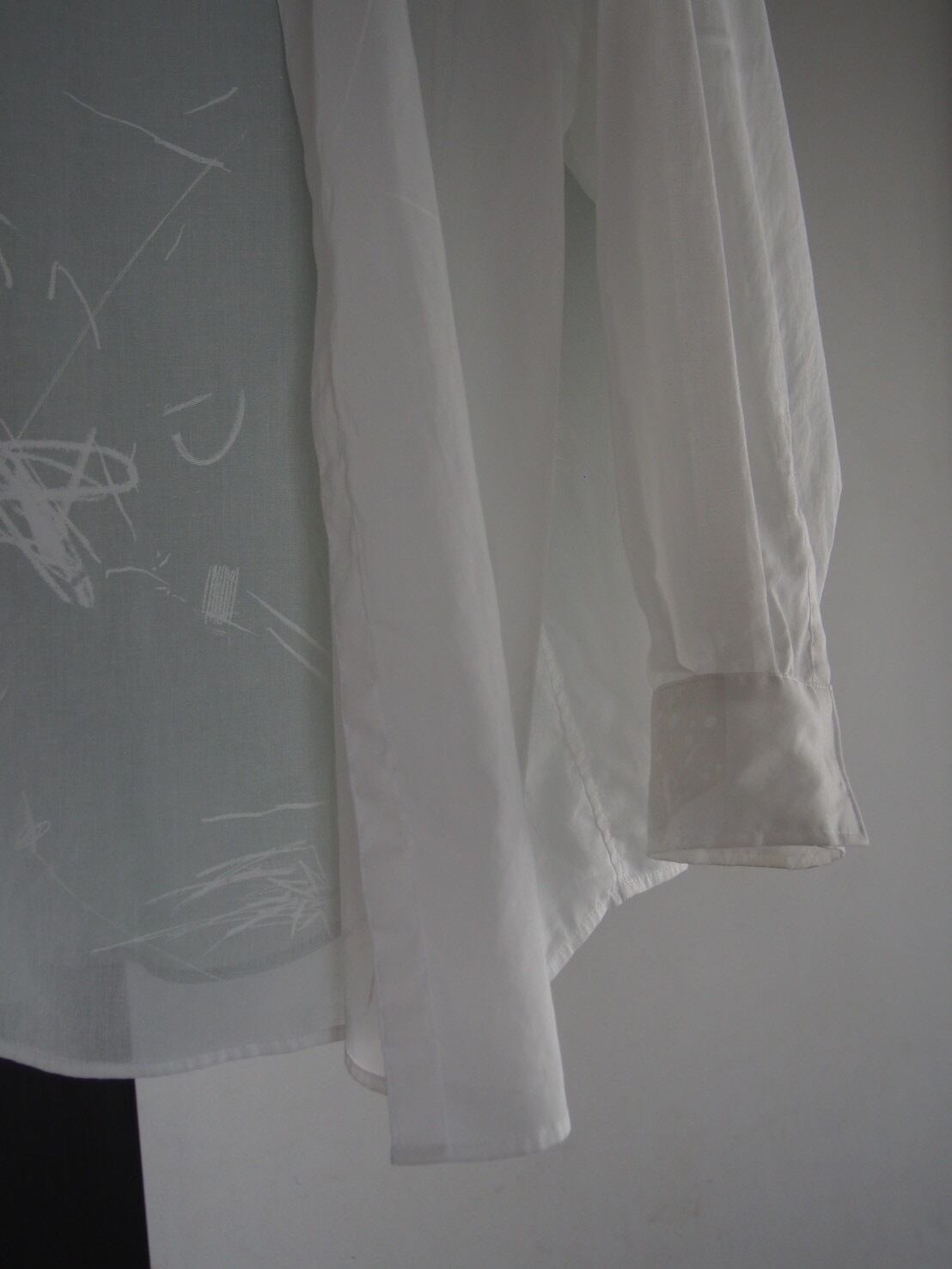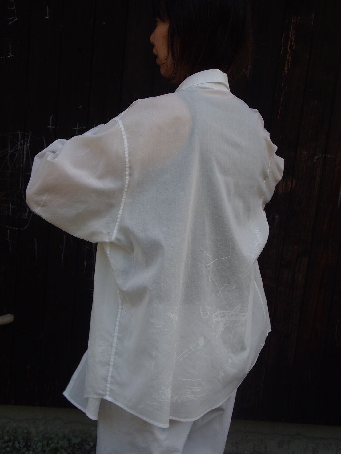 透け感のある軽やかなシャツに、落書きドローイングや、ザリガニモチーフを忍ばせました。